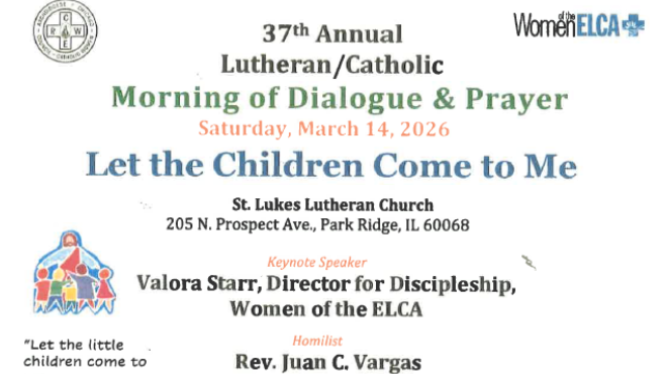 Lutheran/Catholic Morning Dialogue and Prayer will be held at St. Luke’s Lutheran Church 205 N. Prospect, Park Ridge IL 60068 on Saturday March 14, 2026