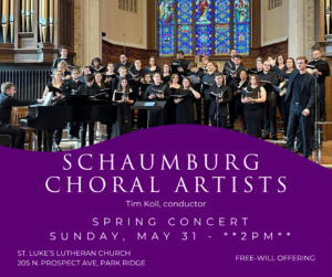 Schaumburg Choral Artists Enjoy a free concert at St. Luke’s by the Schaumburg Choral Artists on Sunday, May 31 at 2 p.m. Share Share on FacebookShare on Facebook TweetShare on Twitter Share on LinkedInShare on LinkedIn Share on WhatsAppShare on WhatsApp Related PostsPick Up a CardApril 9, 2026Celebrating 25 Years of Music MinistriesApril 9, 2026Offering of LettersApril 9, 2026